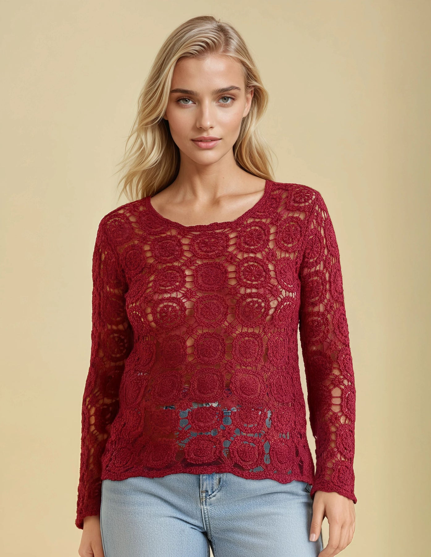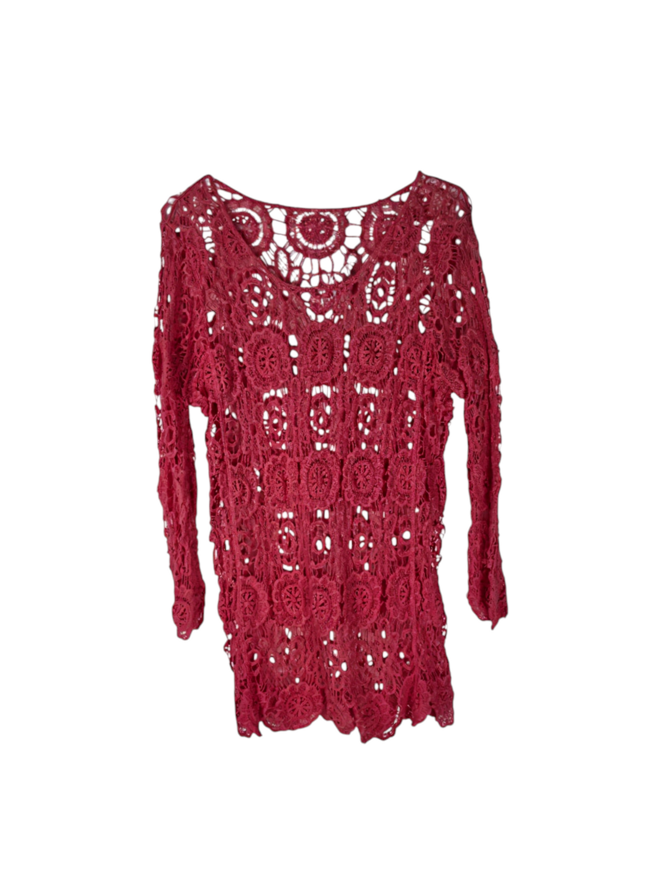 The Crimson Crochet lace top brings a bold, artisan-crafted charm to your wardrobe. With its rich deep red hue and intricate open-knit floral pattern, this piece showcases a beautiful handmade look. Lightweight and breathable, it’s perfect for layering over camisoles, bralettes, or swimwear for a stylish boho touch.