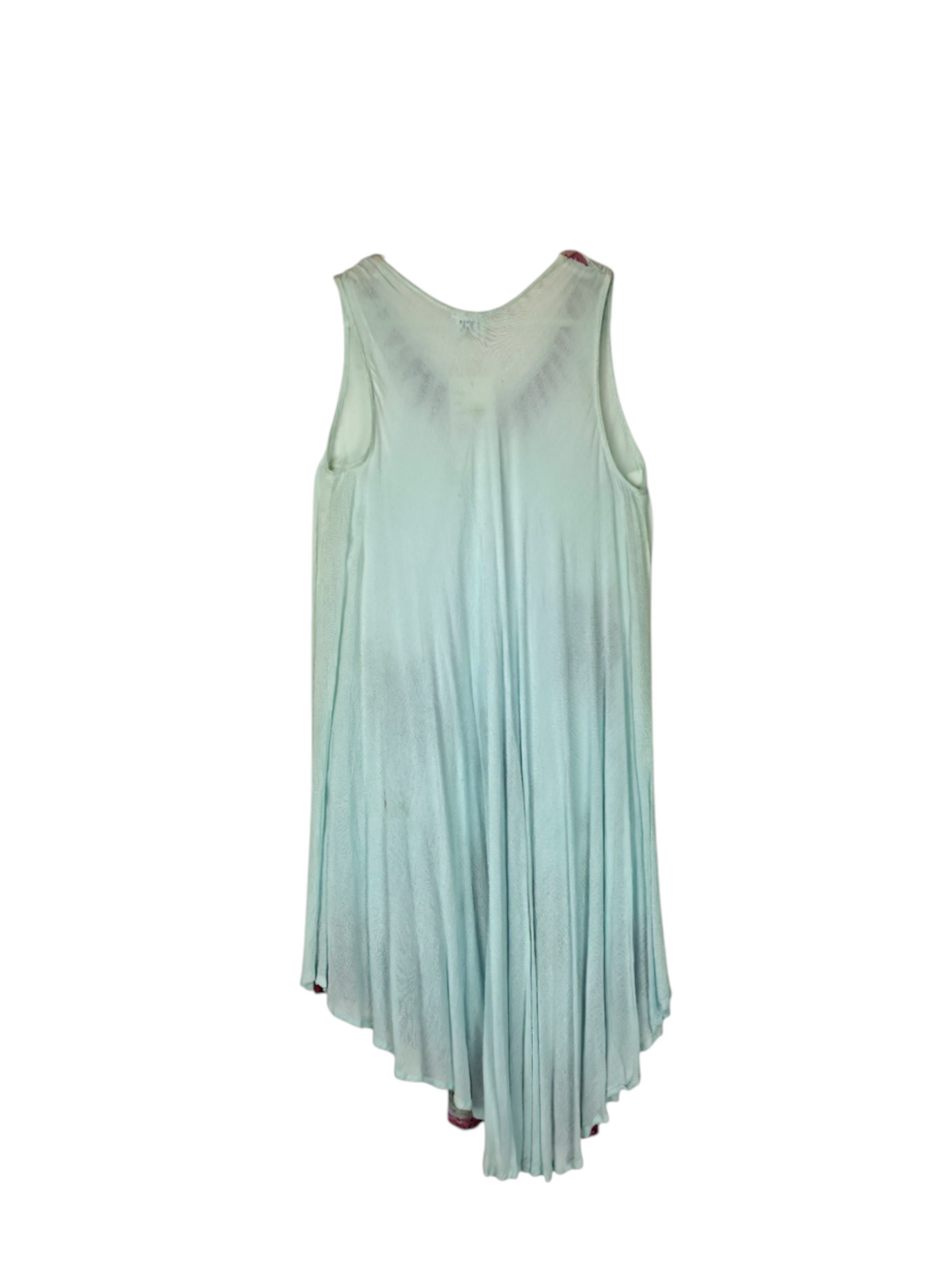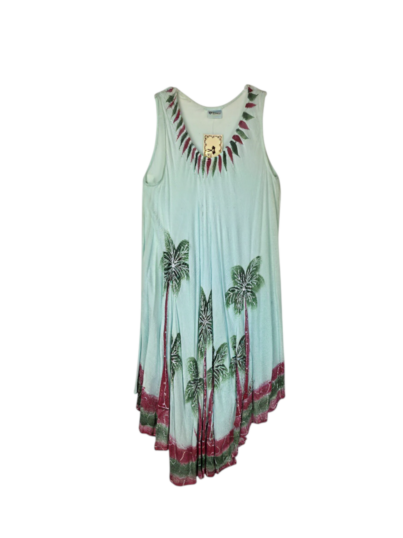Let your spirit wander under sunlit skies in the Island Palm dress — a breezy piece that captures the freedom of ocean air and the serenity of swaying palms. Hand-painted palm motifs drift across a seafoam base, while its asymmetrical hemline and sleeveless silhouette create an effortlessly flowy movement with every step. Light, airy, and full of vacation energy — this dress is pure coastal poetry.