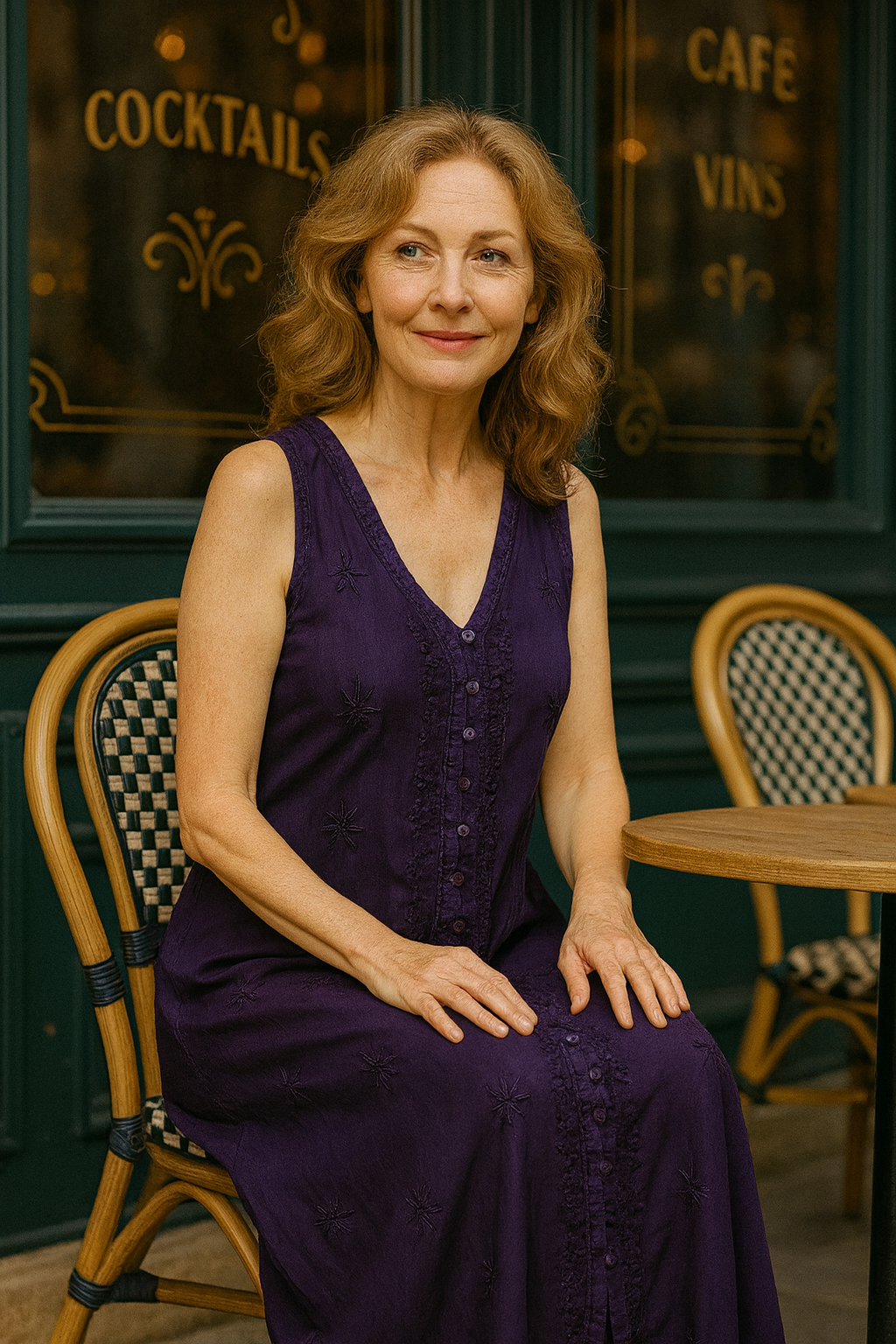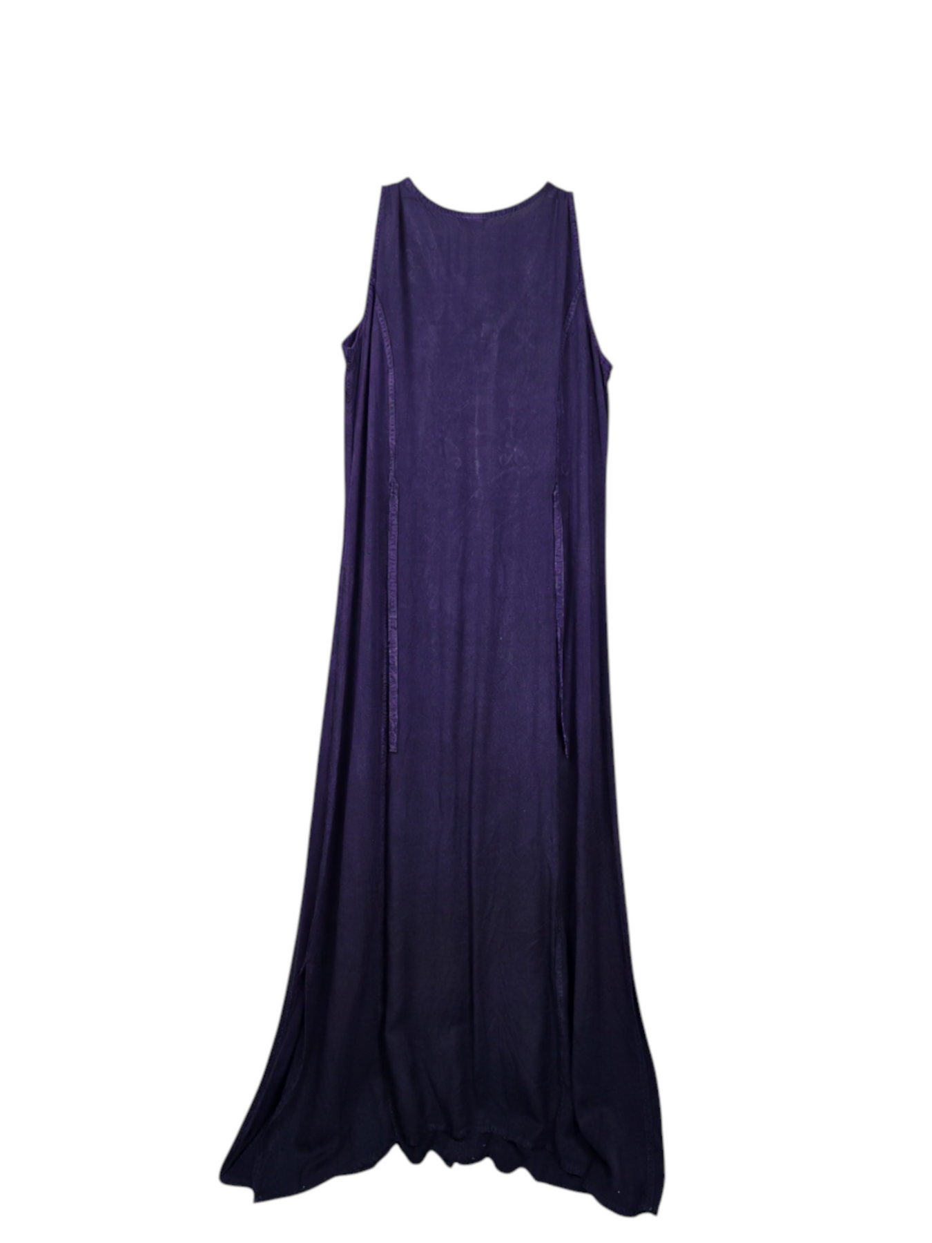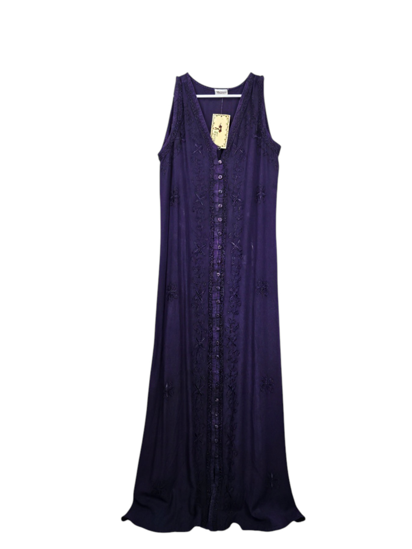 This stunning deep purple embroidered maxi dress combines flowing design with intricate detailing. Crafted from breathable rayon, it features a button-down front, sleeveless silhouette, and elegant embroidery that adds depth and charm. Ideal for evening strolls, weekend getaways, or relaxed dinners.