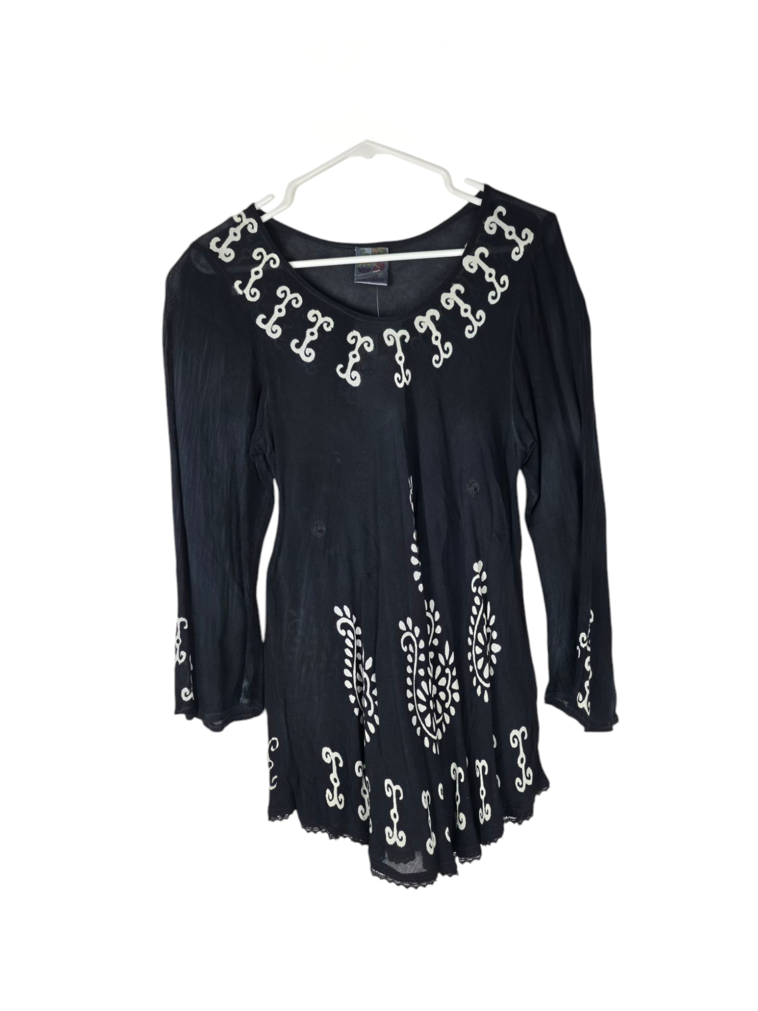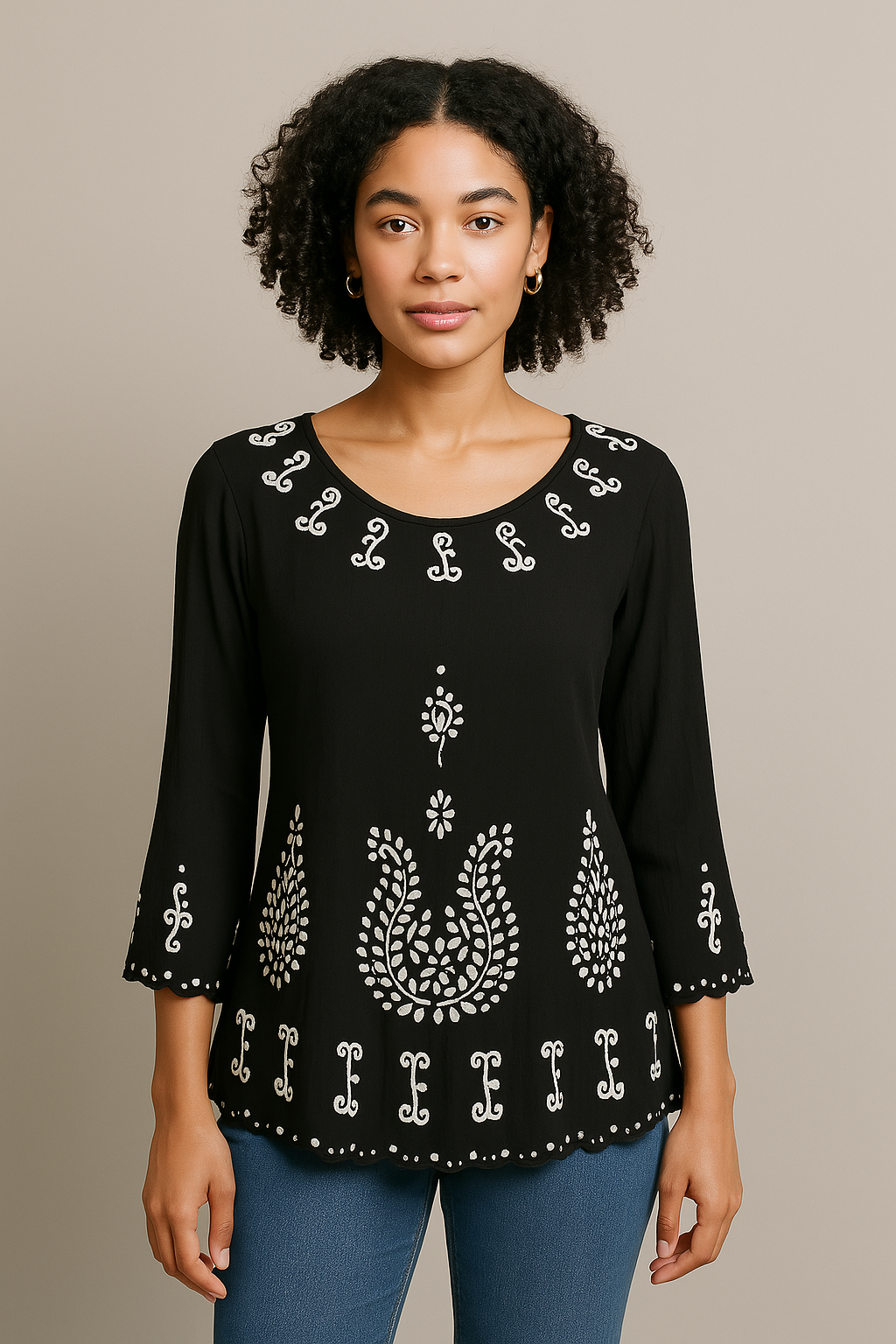 Elevate your everyday with the Unexpectedly You Black Embroidered Tunic. This versatile piece features intricate white embroidery in elegant, swirling patterns that flatter every figure. The soft, lightweight fabric drapes beautifully and feels comfortable all day long.